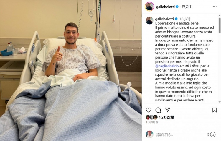 贝洛蒂在社交媒体上发布了术后微笑的照片并配文:“手术进展顺利。第一块砖已经铺好了,现在我们要努力继续建设。在这个艰难时刻,你们的关爱对我至关重要;我要感谢所有牵挂我的人,感谢卡利亚里足球俱乐部及全体球迷的支持,也感谢我效力过的所有球队给予我的祝福。”