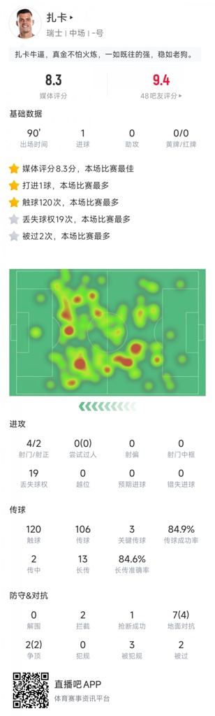 扎卡是瑞士世预赛全胜的核心人员之一,这位桑德兰后腰坐镇中场,稳如泰山。3场世预赛他全部首发打满,瑞士3战全胜进9球0失球。本场比赛对阵拥有2亿锋线双人组的瑞典,扎卡触球120次运筹帷幄,他贡献了3次关键传球,9对抗6成功等不错的数据。